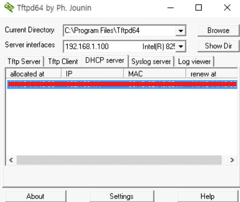 3. Tftpd64를 실행하여 DHCP 탭을 선택하고, Server interfaces에서 설정한 IP를 선택합니다.