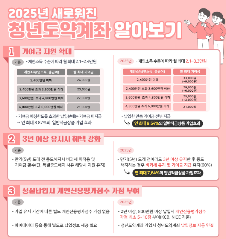 2025년부터는 3년 이상 유지 후 중도해지하더라도 비과세 혜택과 정부기여금의 60%를 받을 수 있도록 개선되었습니다.