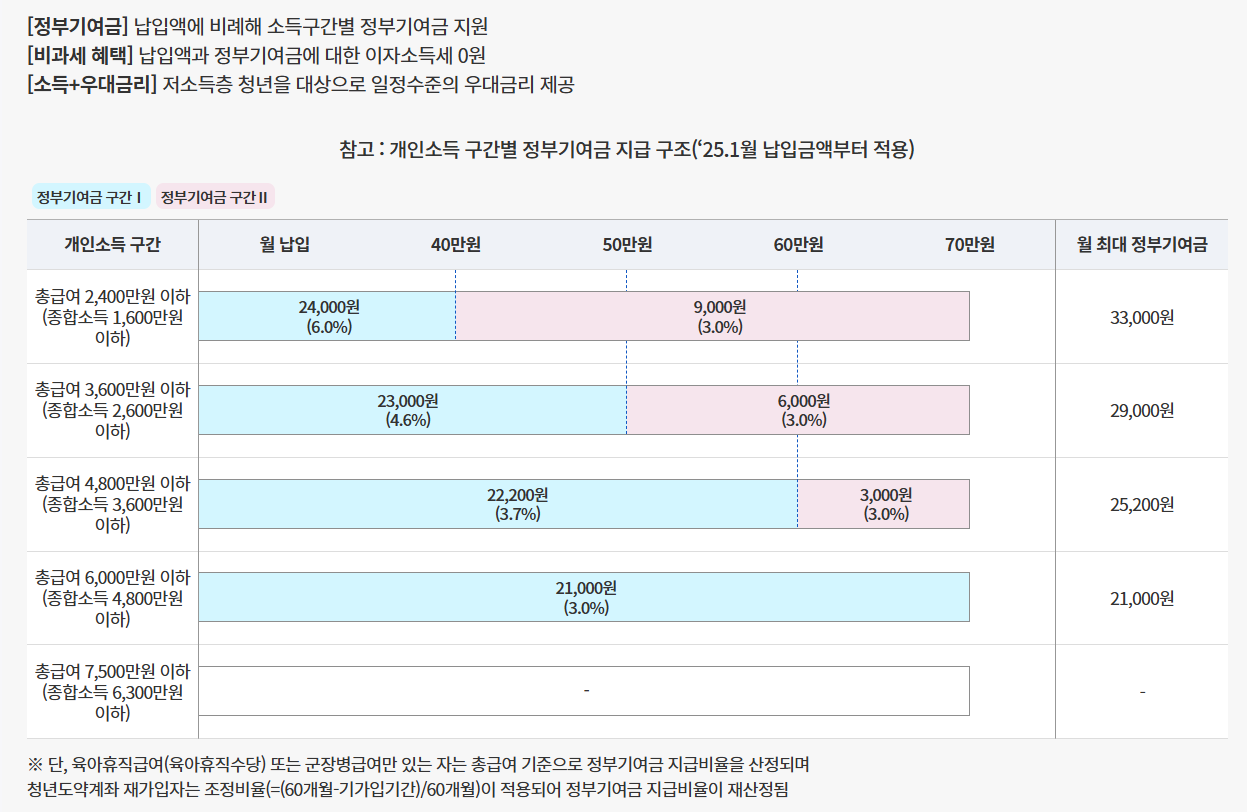 특히 저소득 청년층을 위해 총급여 2,400만원 이하인 경우 월 최대 3.3만원(매칭비율 6.0%)의 높은 지원금을 제공합니다.
