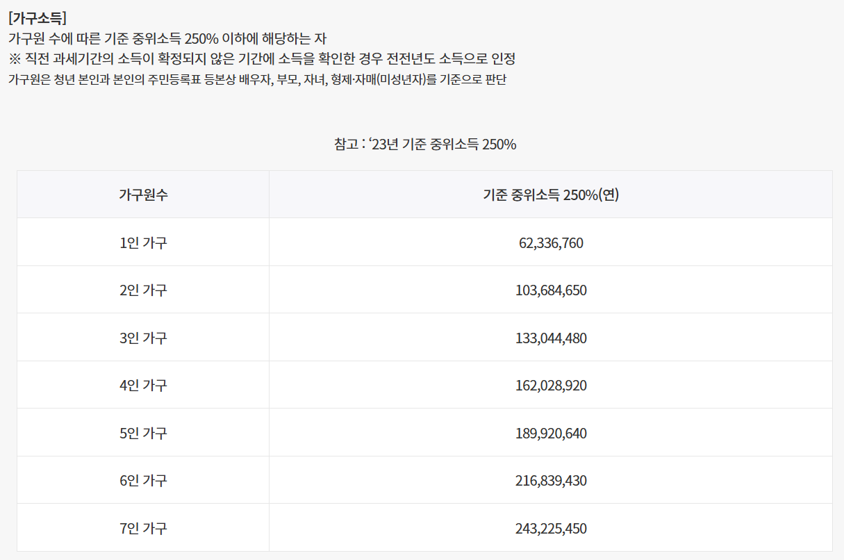 청년도약계좌는 연 소득 7,500만원 이하이면서 종합소득과세표준에 합산되는 종합소득금액이 6,300만원 이하이고, 가구원 수에 따른 기준 중위소득 250% 이하인 청년이 가입할 수 있습니다.